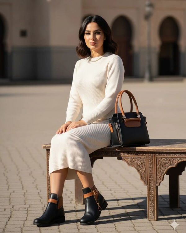 هاد الباقة كتجمع بين الأناقة والعملية، صباط وصاك بنفس اللون و الثوب كيمنحوك لوك متناسق بلا مجهود